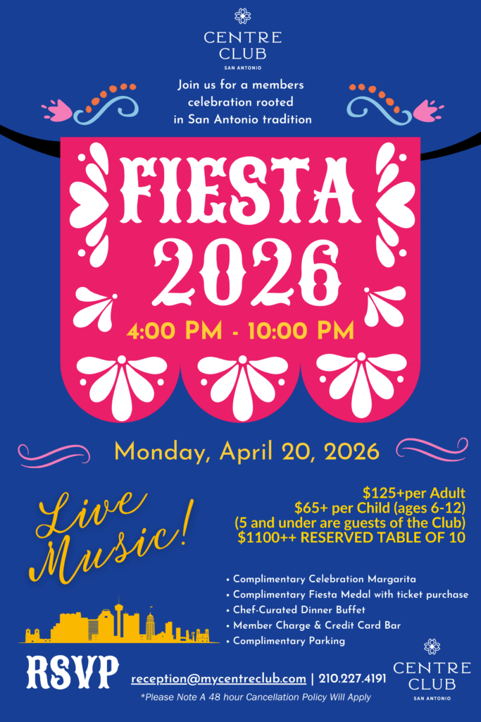 We’re bringing the celebration back to Centre Club for Fiesta 2026 — an evening rooted in San Antonio tradition. Join us for live music, a chef-curated dinner buffet, and festive cocktails, plus enjoy a complimentary celebration margarita and Fiesta medal with ticket purchase.